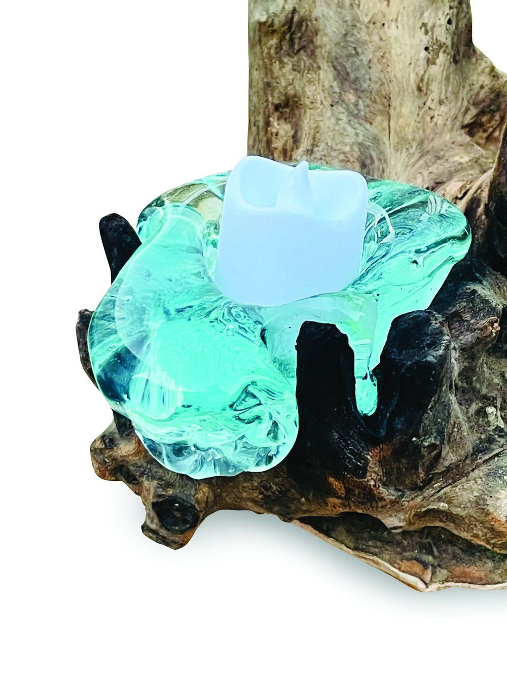 Introduce organic artistry to your home with this handcrafted sculpture that combines natural teak root with four removable hand‑blown glass candle holders. Each glass cup is individually moulded onto selected teak root pieces so the final effect appears as glass melting into wood.