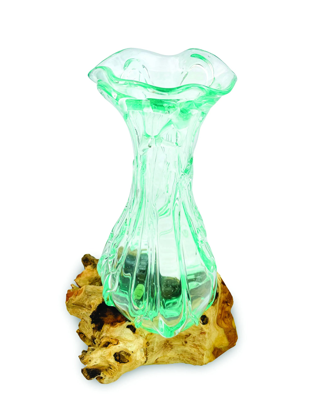 This decorative glass sculpture pairs a hand‑blown, crinkle molten glass vase with an individually selected teak root base. The glass is moulded to sit as if melting into the driftwood, creating a striking, Dali‑style focal piece for a mantel, sideboard or display shelf.