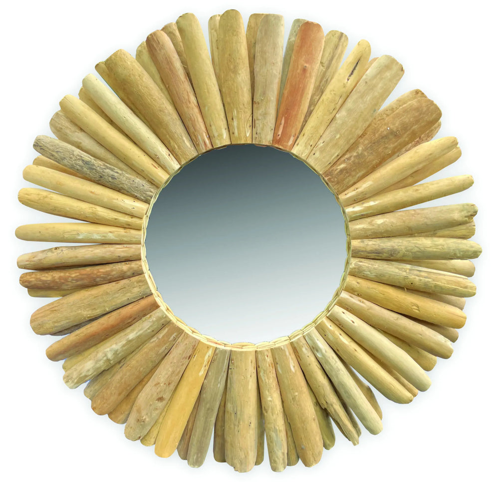 Individually carved pieces of teak root are arranged in a circular pattern to form this round driftwood style mirror. Also available in 60cm and 40cm.