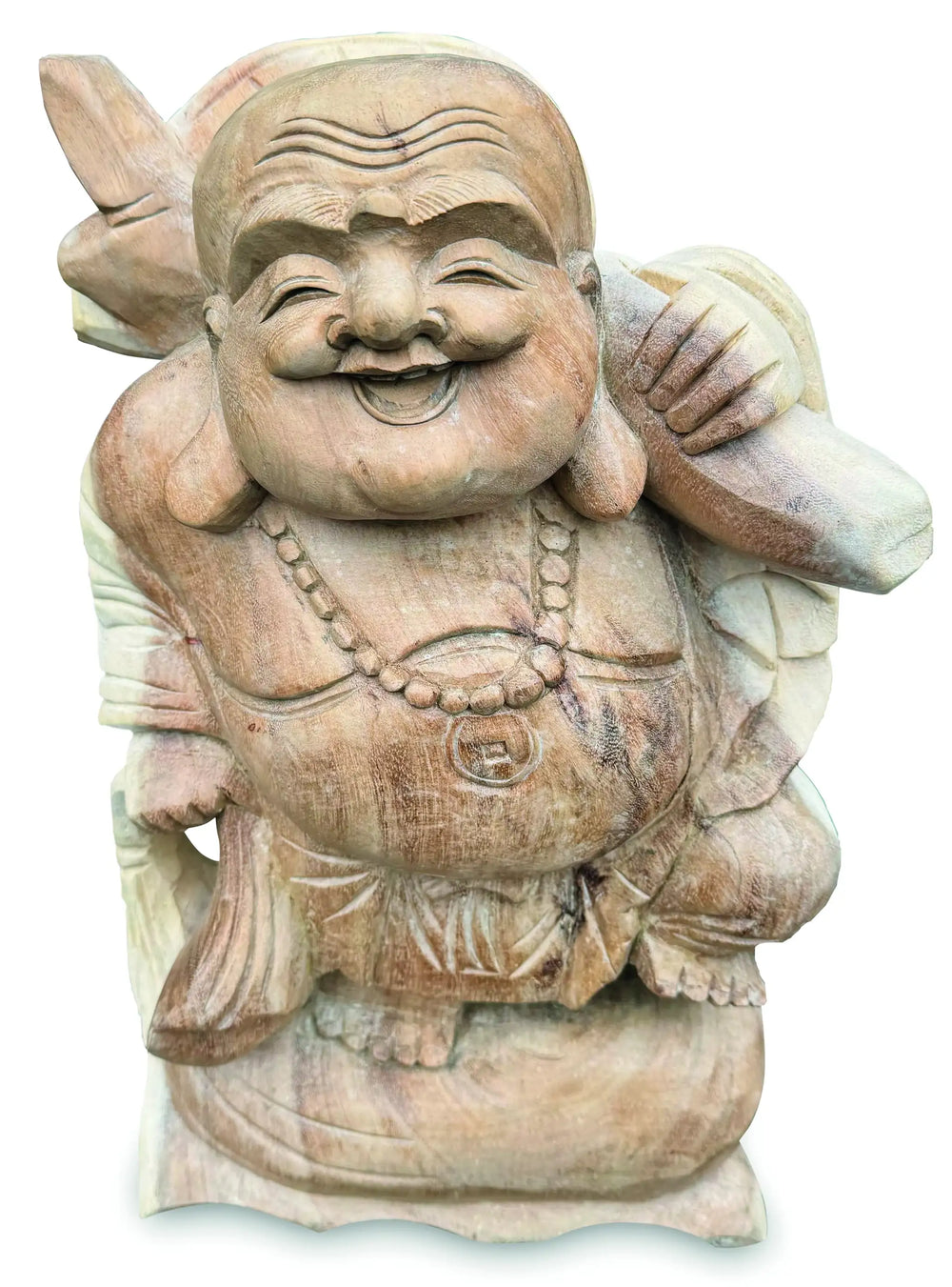 This hand-carved Laughing Buddha sculpture is crafted from solid wood by Indonesian artisans. The joyful figure symbolises happiness, good luck and plenitude, and is designed as an ornamental piece for display in living rooms, altars or entranceways.