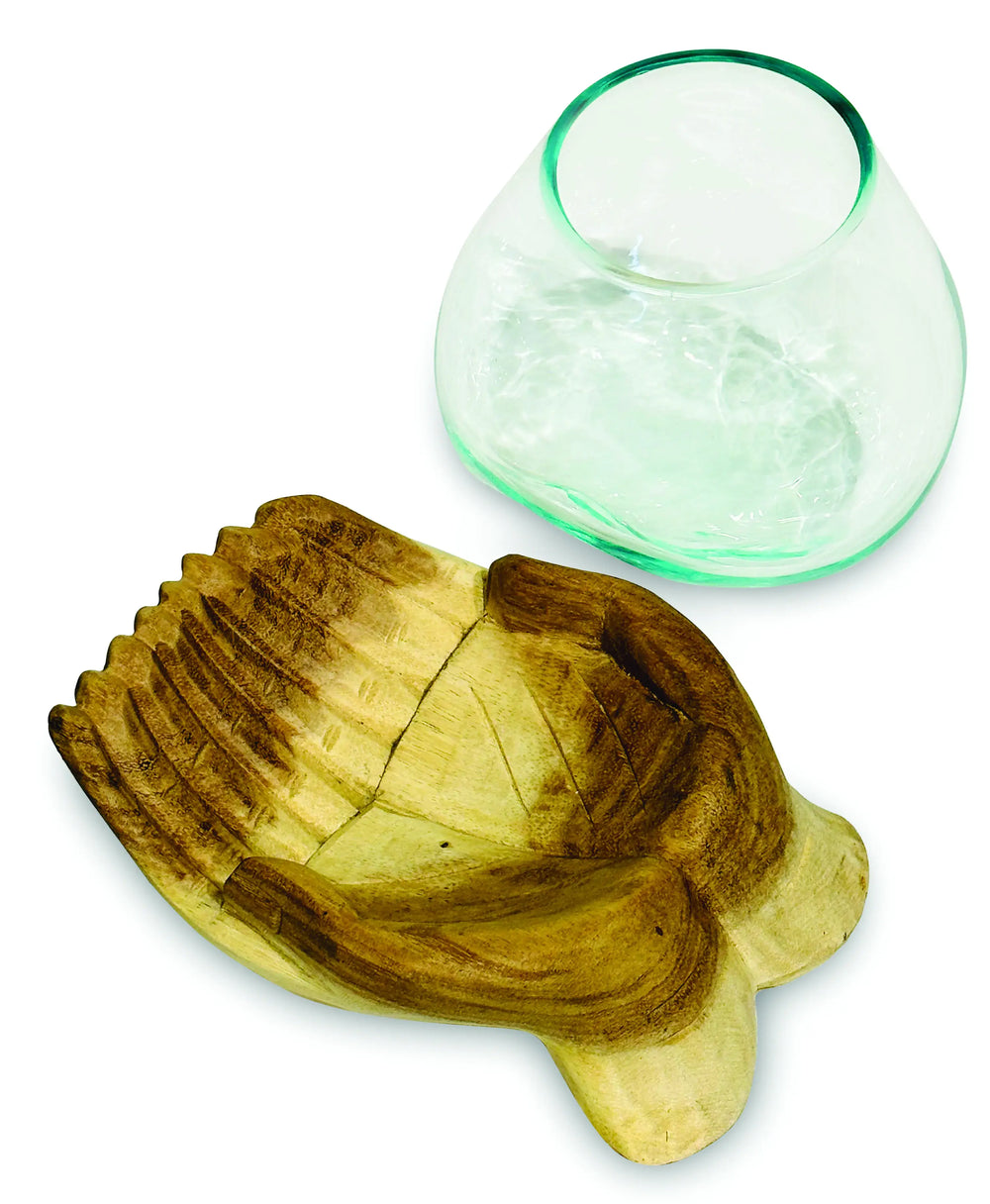 Introduce artistic flair with this distinctive glass sculpture: a removable, hand-blown bowl cleverly moulded onto a hand-carved double 'hand of hope', creating the impression of molten glass flowing into the sculpted hands. Each piece is crafted to be a decorative focal point for mantelpieces, shelves or side tables.