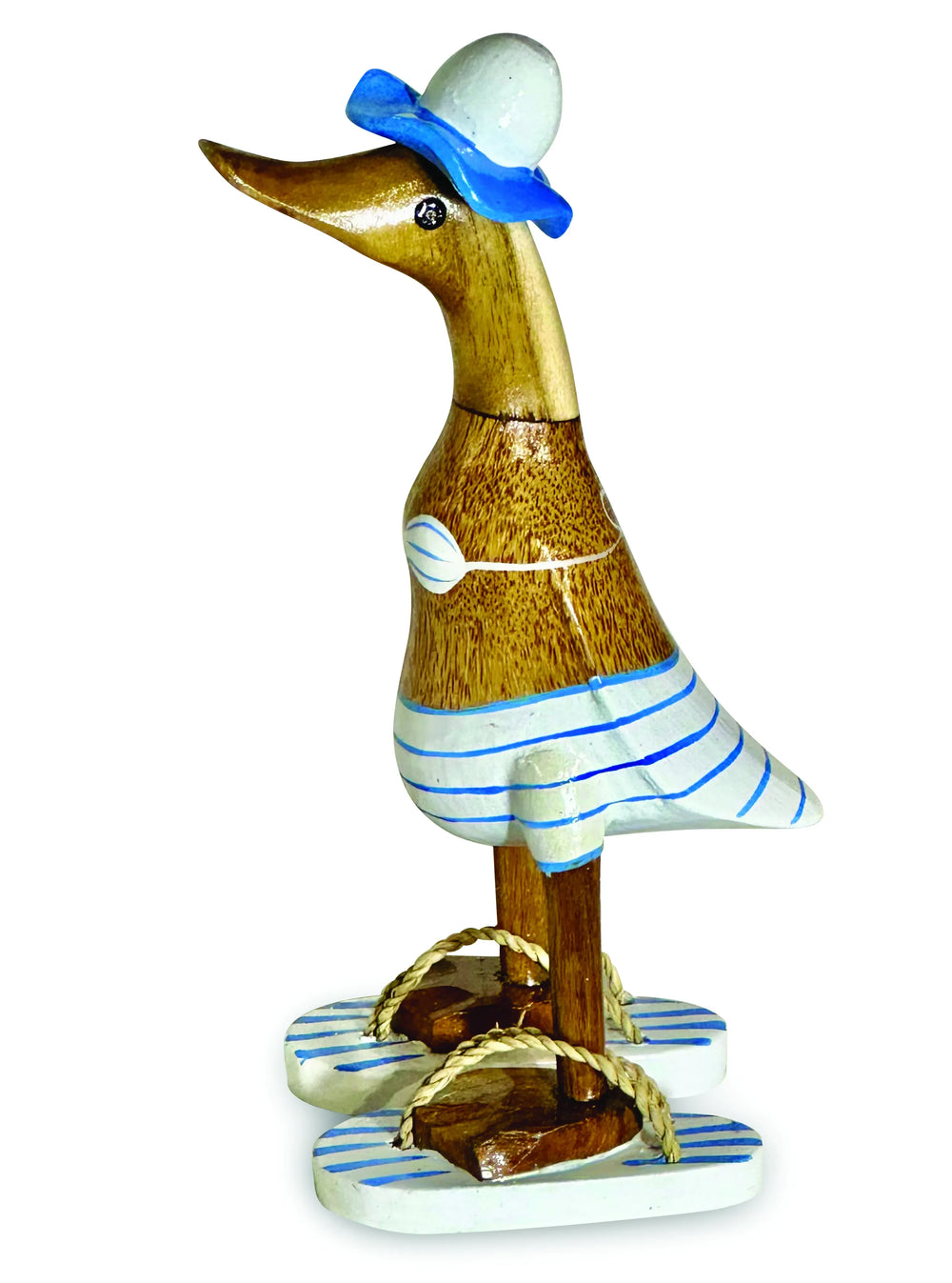 Standing 25cm high, our cute Bali Bikini Duck is ready for the beach with a hand-painted bikini, hat and flip-flops in nautical blue and white stripes. Indonesian artists use traditional carving techniques to create our fabulous duck range - hand-painted and hand carved from sustainable bamboo.