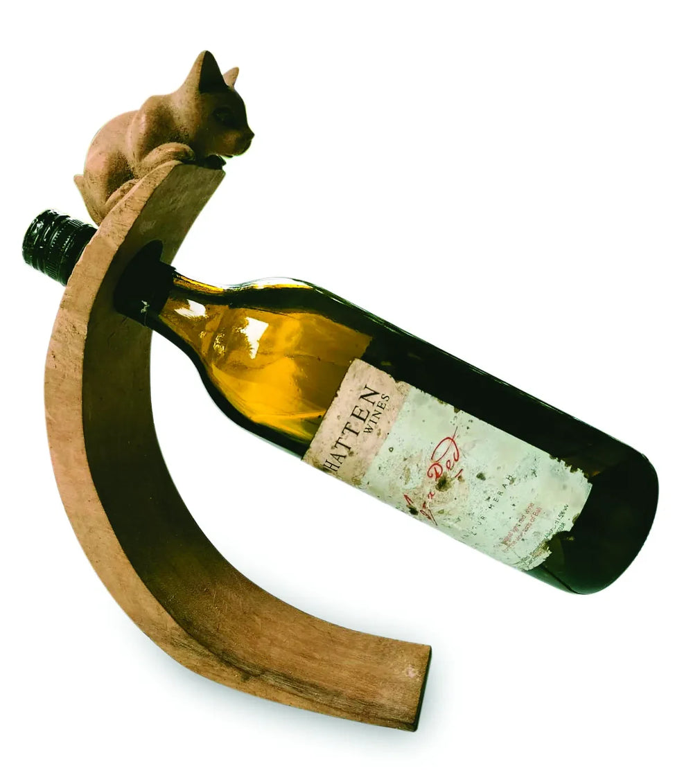 Our curved balance wine bottle holders defy the laws of gravity! Hand carved from hardwood, this one has a cute little cat watching over the bottle.