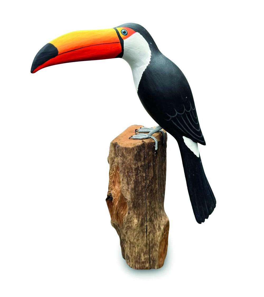 This hand-carved toucan is crafted from teak tree roots and hand-painted with fine detailing. Each piece is unique in grain, colour and carving, so no two will be exactly the same. The sculpture shows a toucan perched on a carved tree trunk and makes a striking natural accent for shelves, mantelpieces or display cabinets.