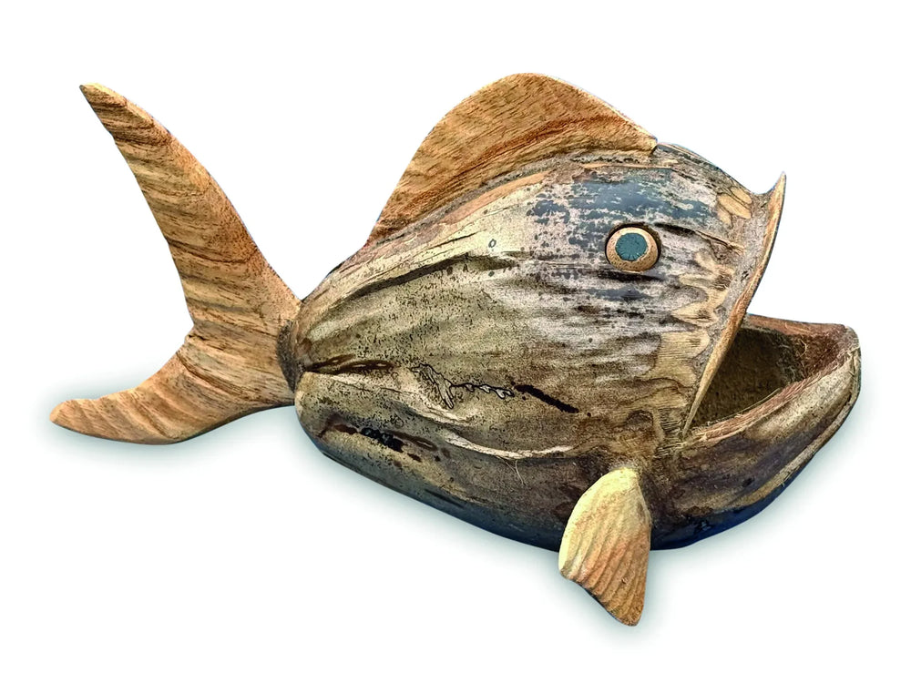 Recycled, discarded coconut shells are one of the most versatile materials around with a multitude of uses, including handicrafts. Our perky little puffer fish is hand-carved with hand-painted detail.