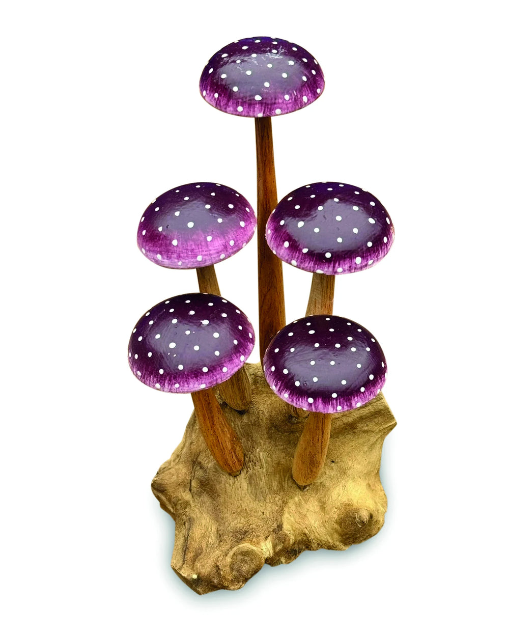 Our painted mushroom sculptures present a range of hand-carved and hand-painted mushrooms inspired by the natural world. This sculpture features five fabulous purple, white-spotted mushrooms growing from a root base. Also available with 3 purple mushrooms.