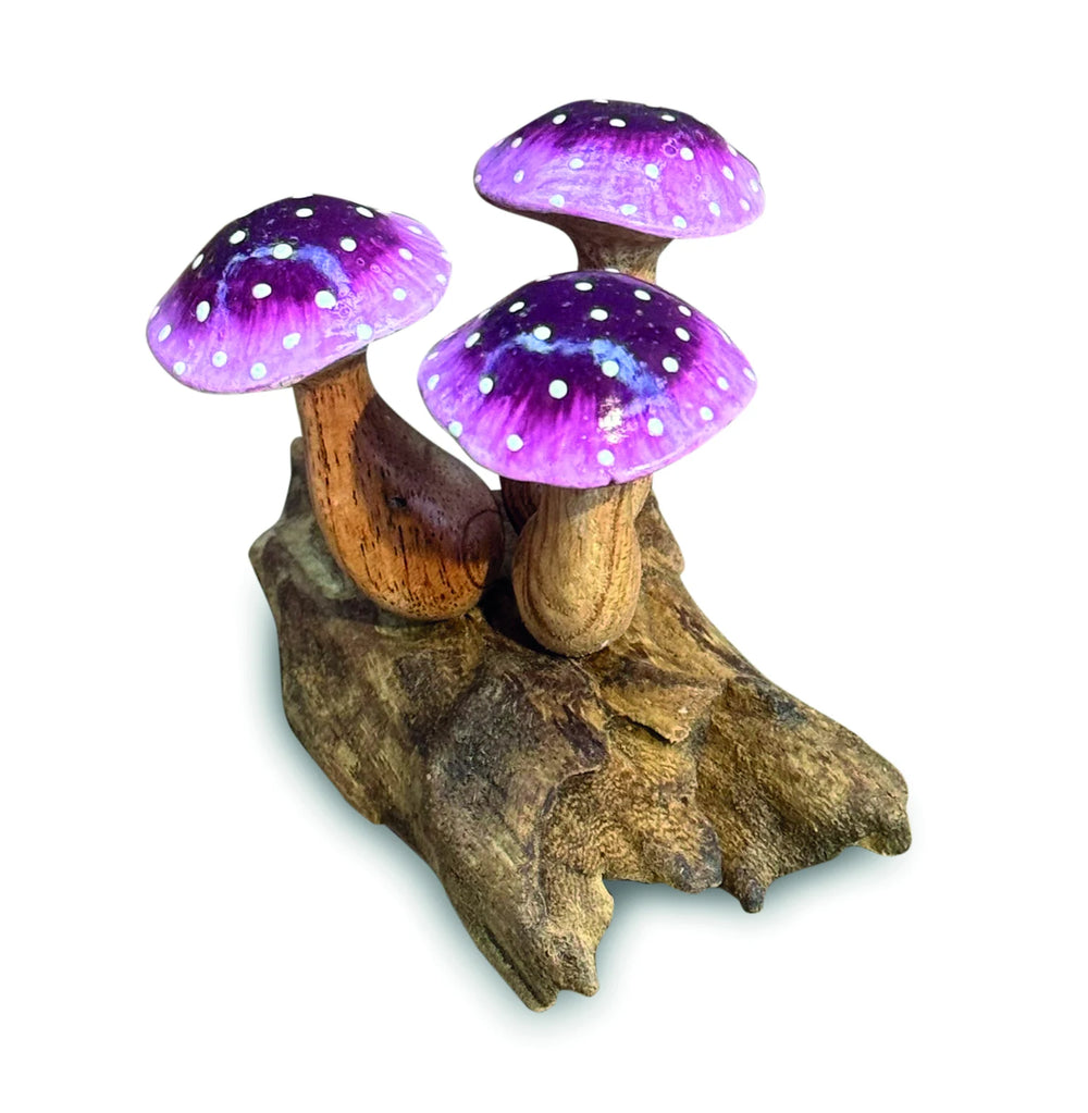 This charming tabletop sculpture shows three hand-painted lilac bonnet mushrooms growing from a natural teak root base. Each mushroom is hand-carved and hand-painted to capture delicate white-spotted caps and organic textures inspired by the natural world.