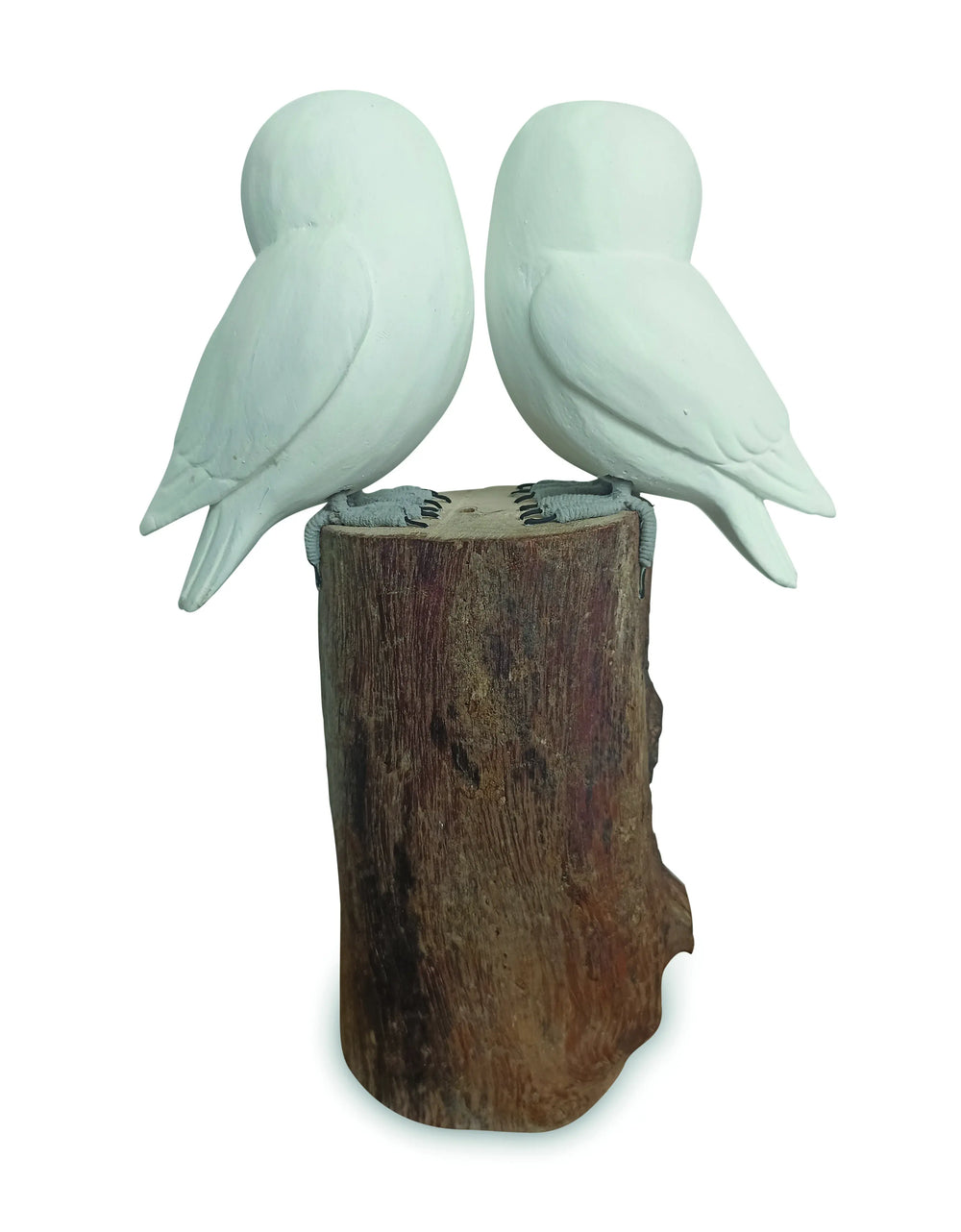 Two hand-carved owls perch on a tree trunk in this painted-white decorative ornament, supplied ready for you to add your own colours and detailing. Each piece is hand crafted, so appearance will vary slightly from the image shown, making every item unique.