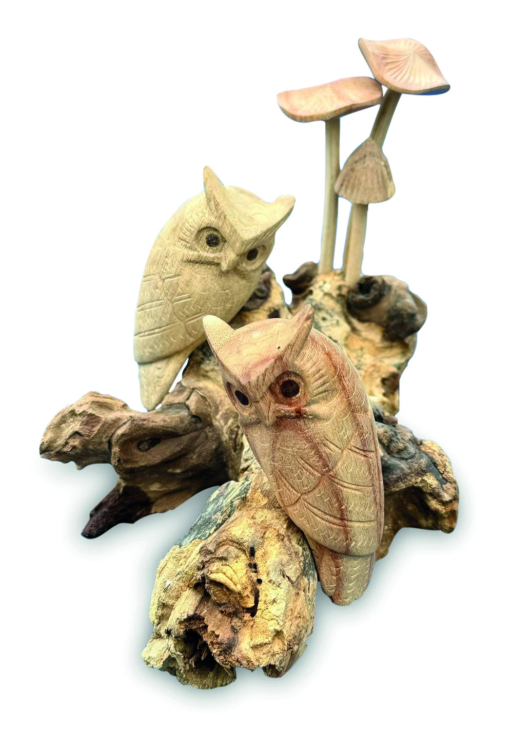 Two adorable hand-carved owls sit among a cluster of tiny hand-carved mushrooms in this charming decorative piece. Each item is crafted by hand, so no two are identical; natural variations in carving and finish make every piece a one-off keepsake for the garden or home.