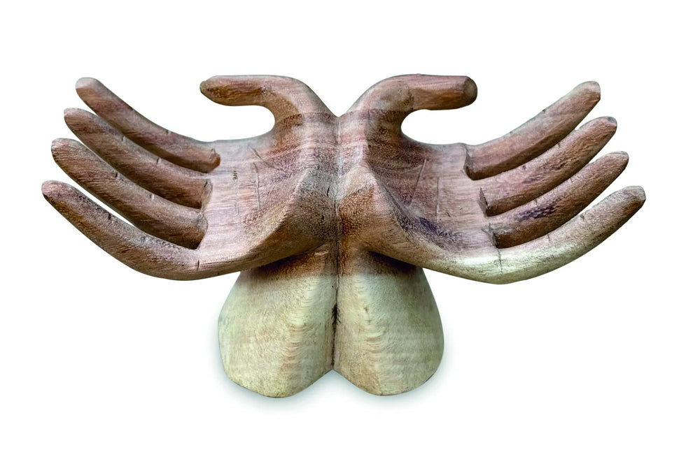 Two hand-carved hands are held together to form this Sharing Hands Bowl, designed for serving snacks or fruit and for decorative display. The sculptural form brings a tactile, crafted presence to a dining table, sideboard or kitchen counter.