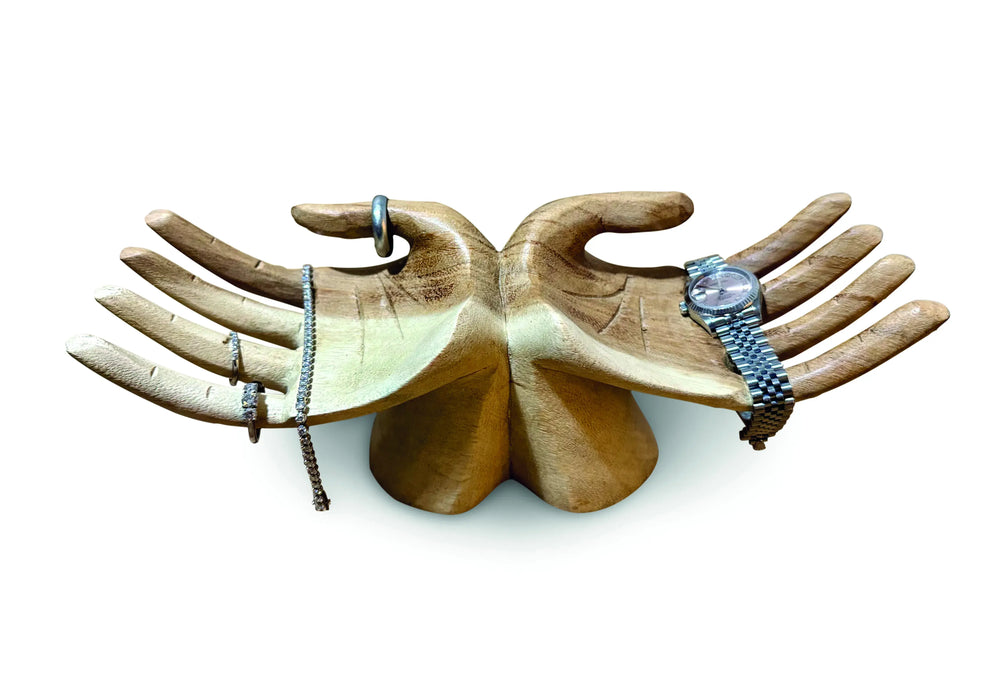 - Hand-carved design: sculpted hands form a warm, tactile vessel that works equally well as a fruit bowl, snack bowl or decorative accent.