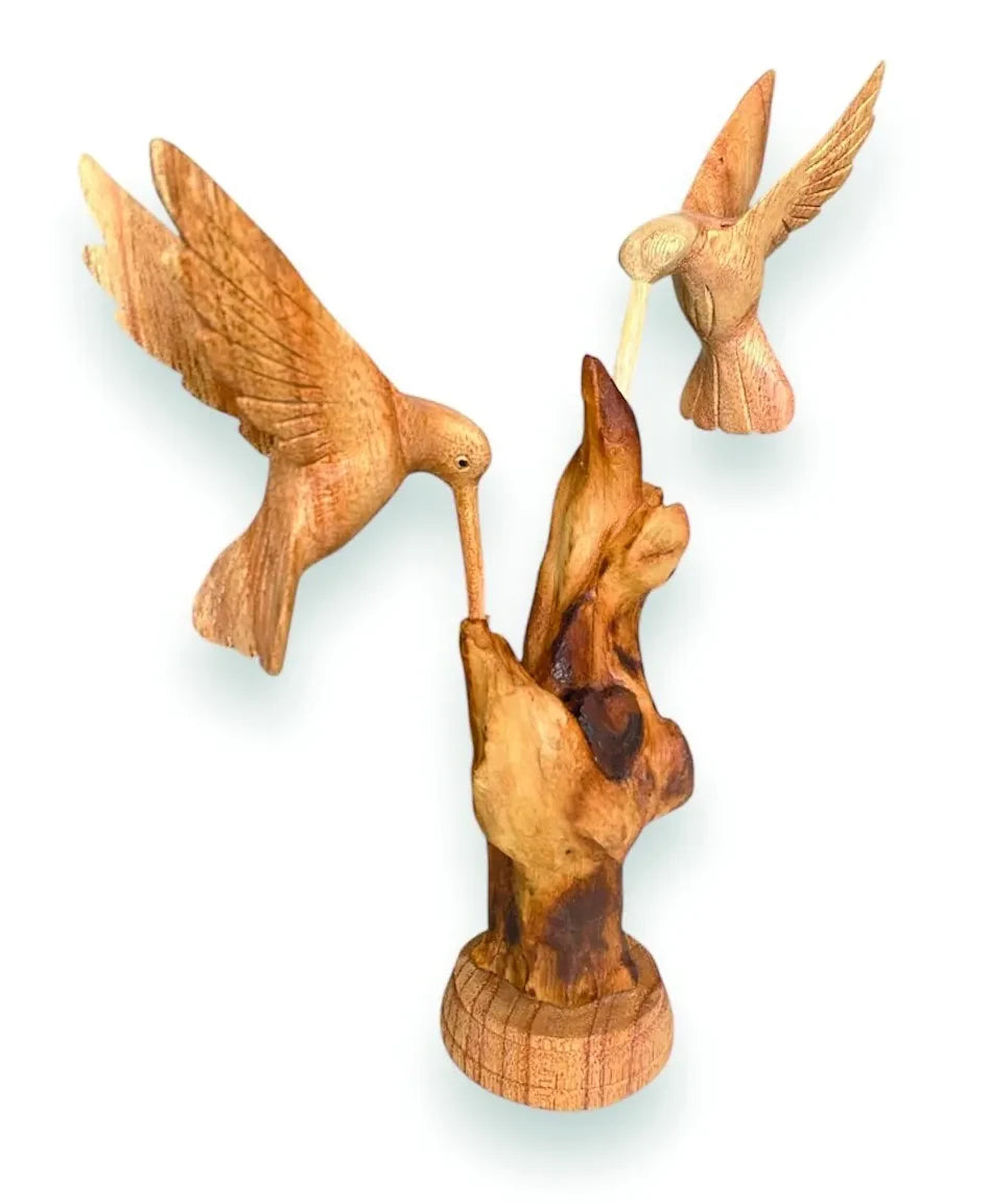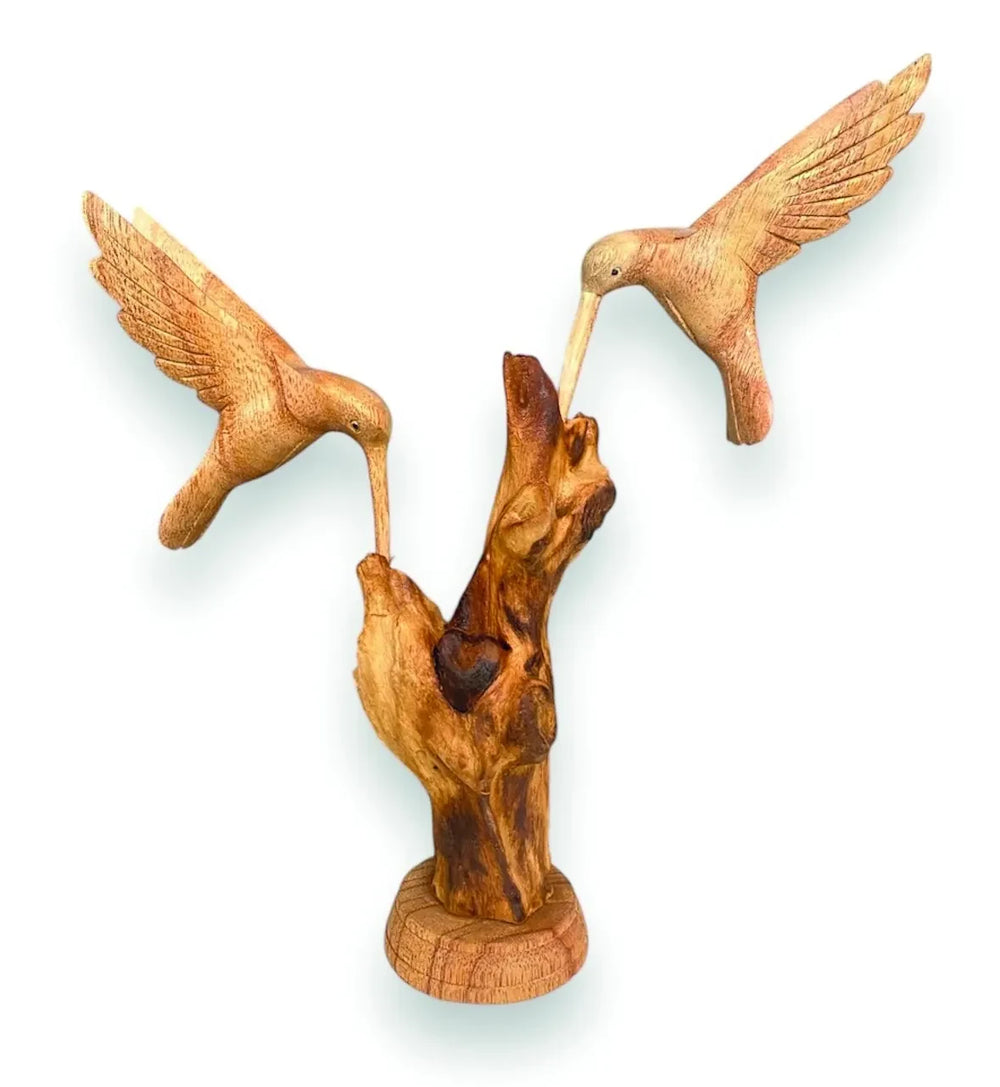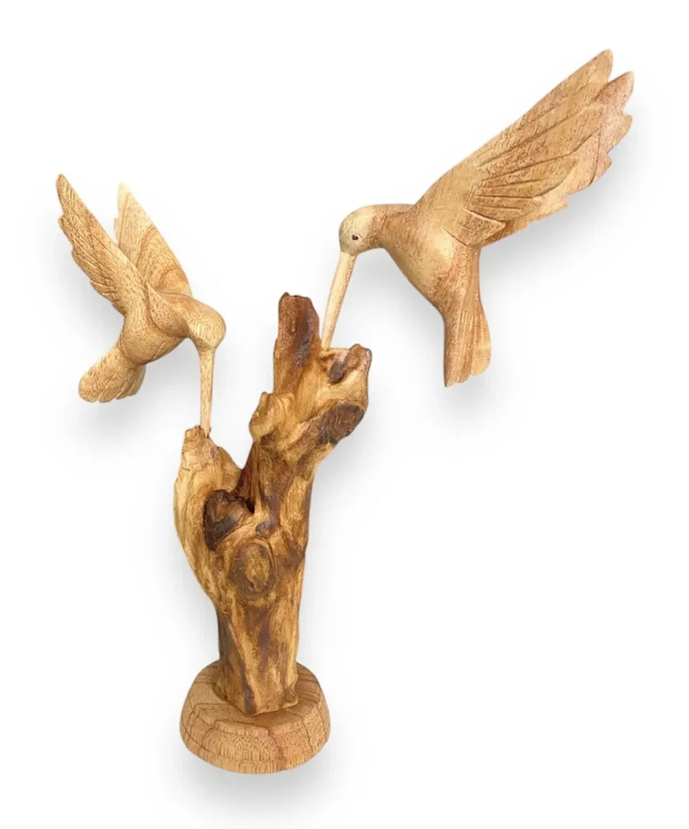 Our hand-carved hovering hummingbird sculptures display the natural charm of these gorgeous birds. This sculpture shows two birds feeding on a wooden base single hummingbird feeding and single hummingbird drinking from a flower also available.
