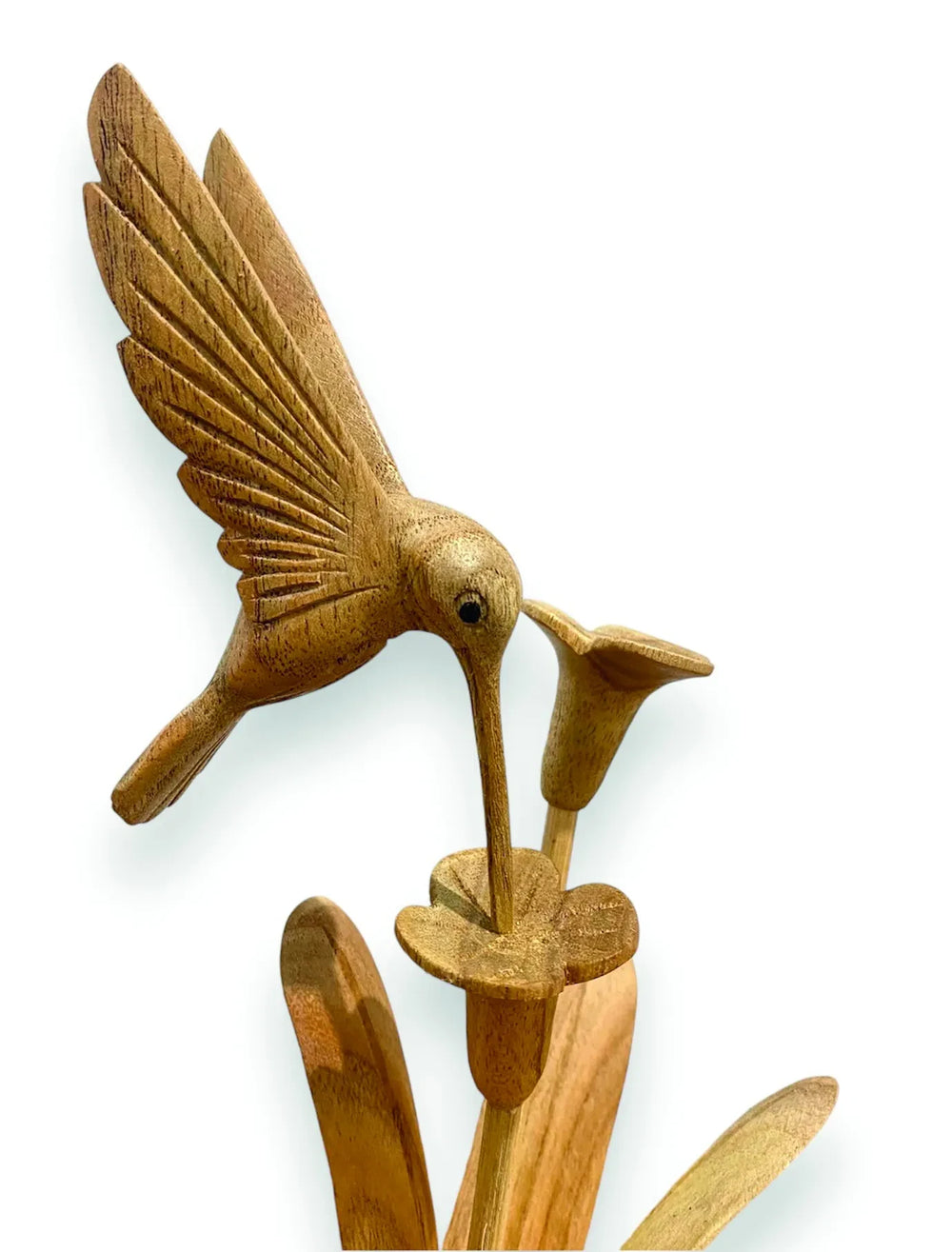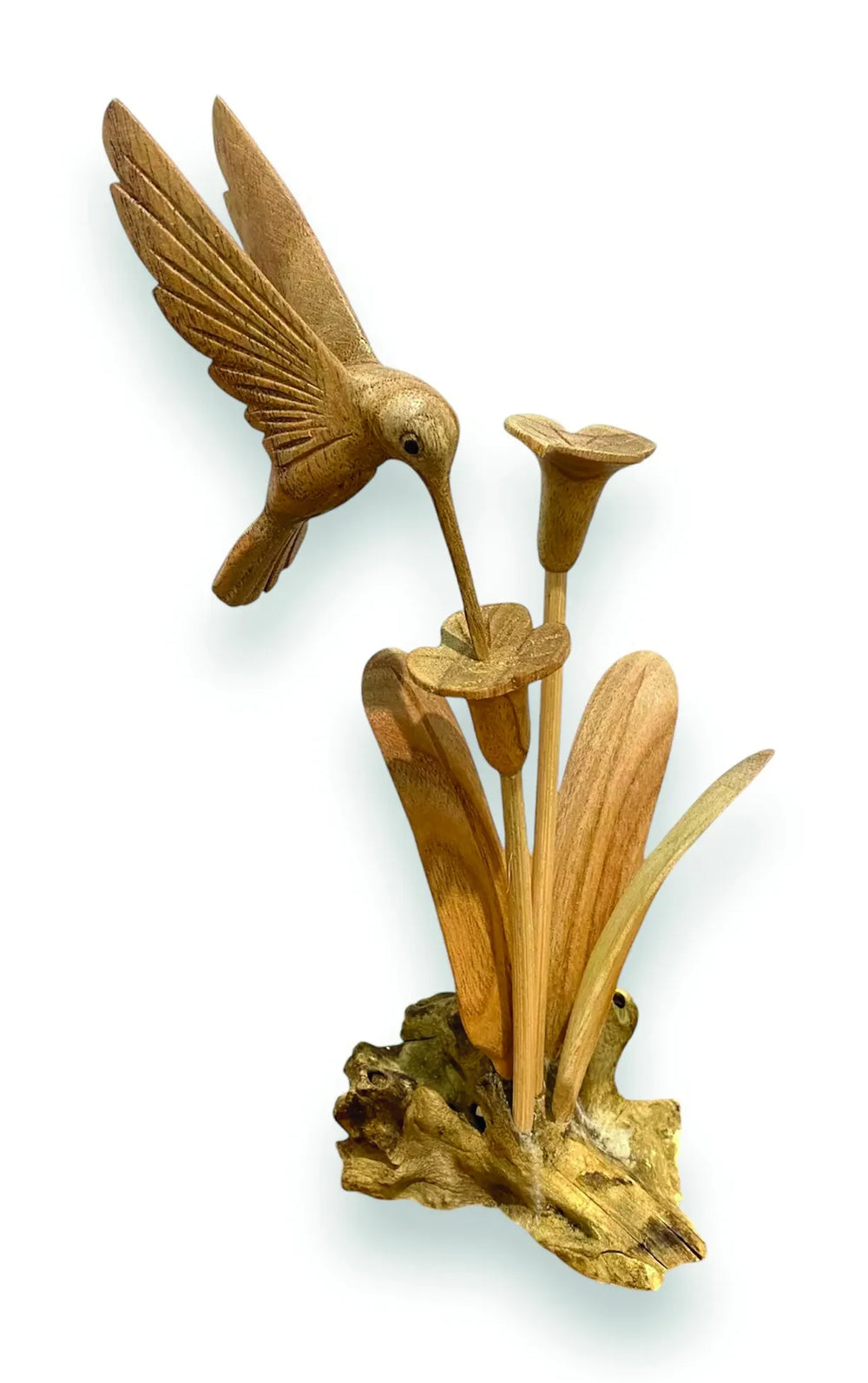 This hand-carved hummingbird sculpture captures the delicate moment of a single bird drinking nectar from a flower. Carved by hand, the piece sits on a wooden base and brings natural charm to a shelf, mantel or display cabinet.