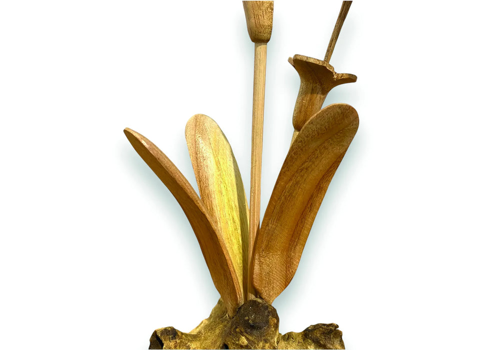 To preserve the piece, avoid prolonged direct sunlight and extreme humidity. Regular gentle dusting and occasional polishing will help maintain the wood’s appearance and extend the life of the sculpture.