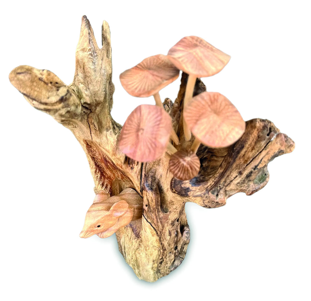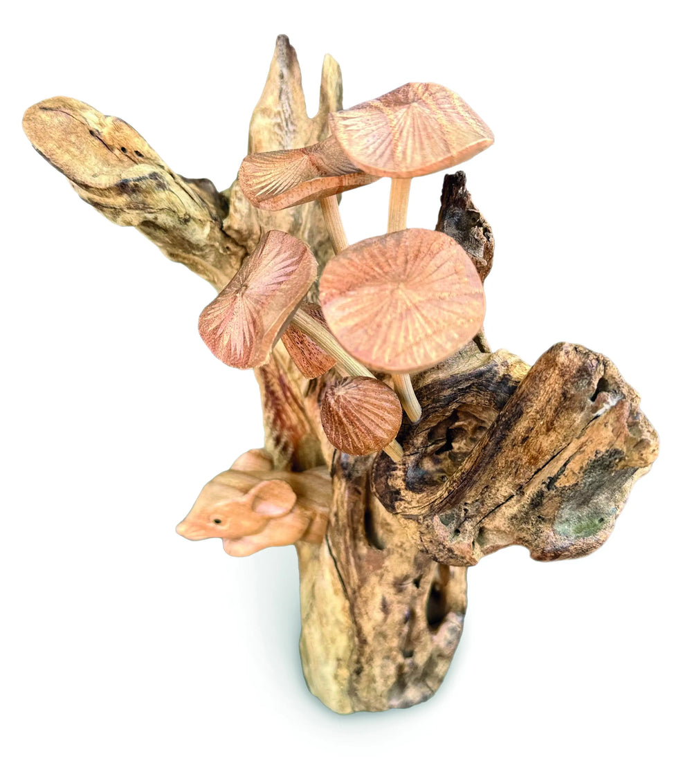 Shy little mouse, hiding under a cluster of mushrooms growing from a wooden base. Hand-carved from sustainable albasia wood.