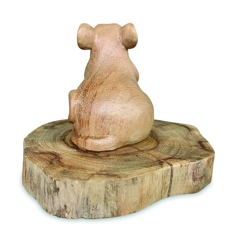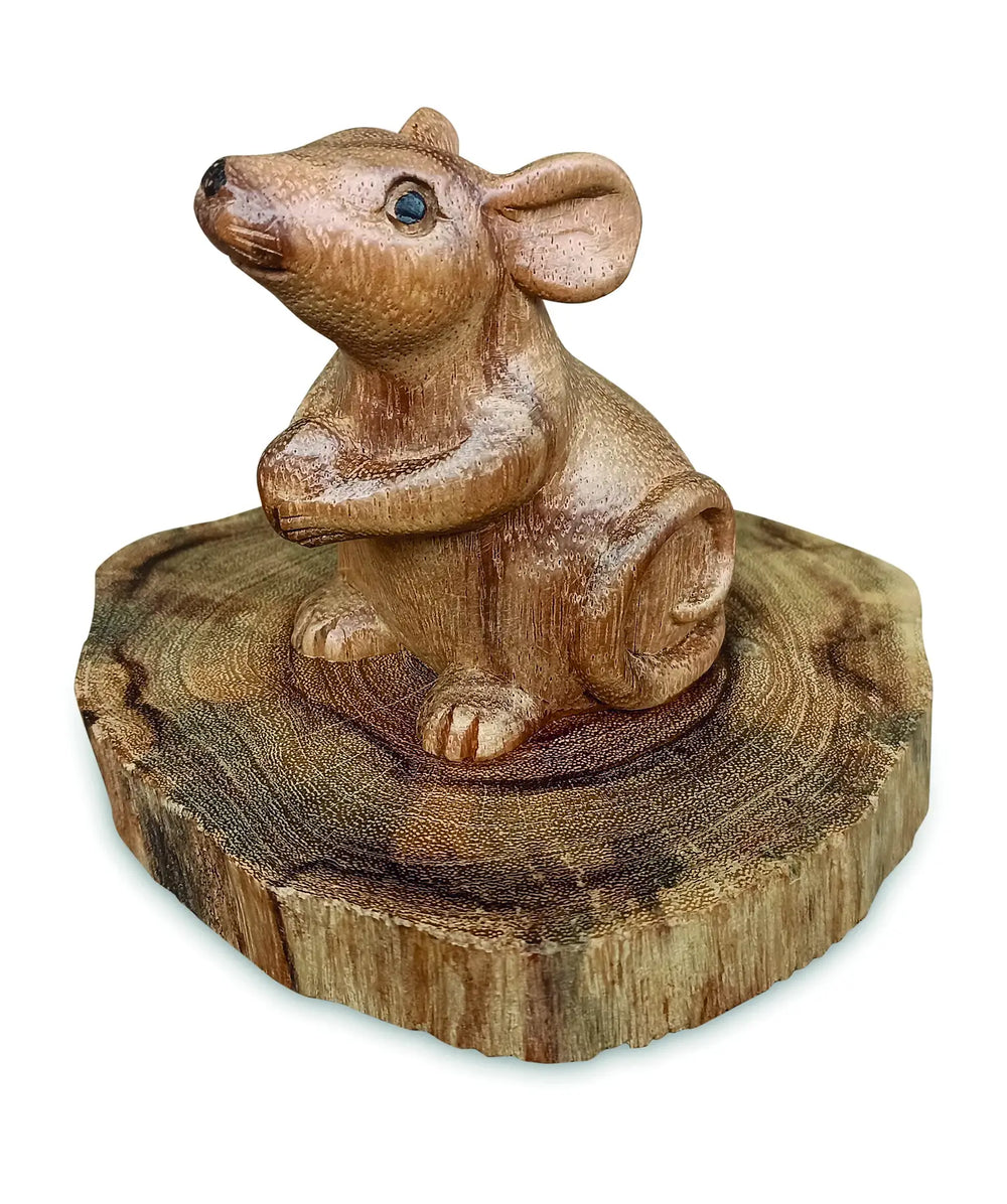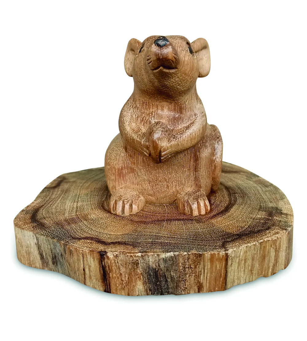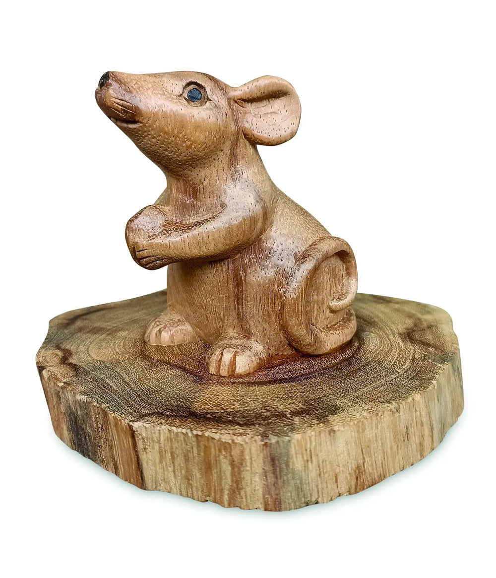 Adorable little mouse, sitting up on its hind legs holding a tasty treat. Hand-carved from suar wood with charming detail.
