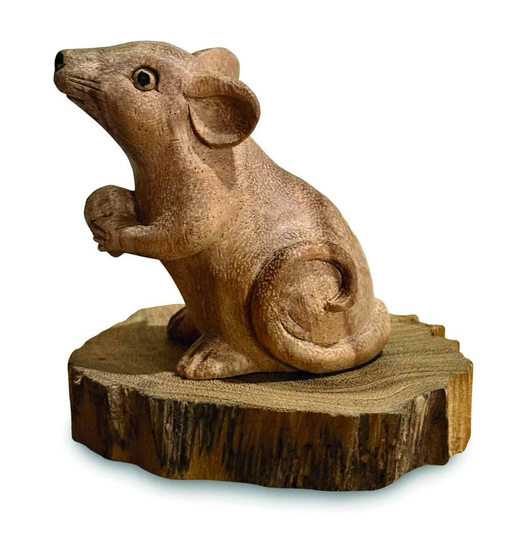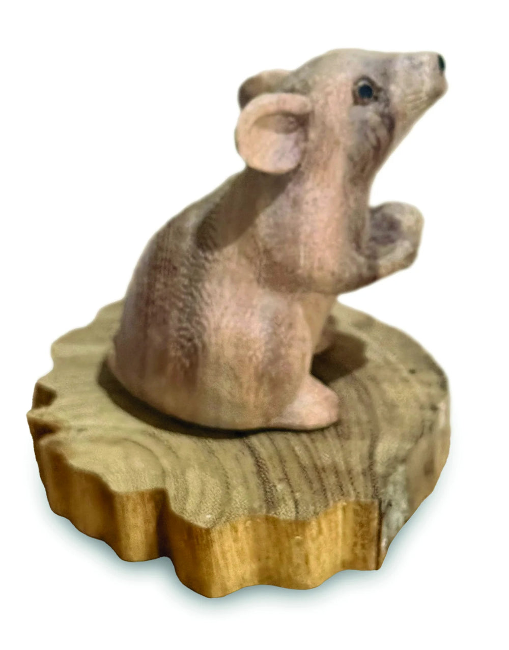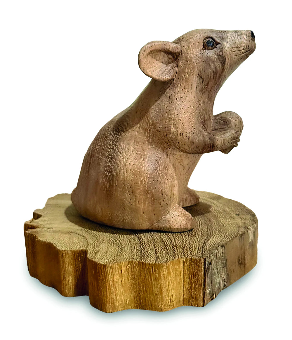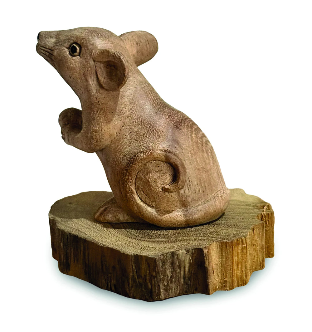 Adorable little mouse, sitting up on its hind legs holding a tasty treat. Hand-carved from suar wood with charming detail.