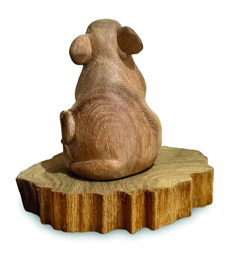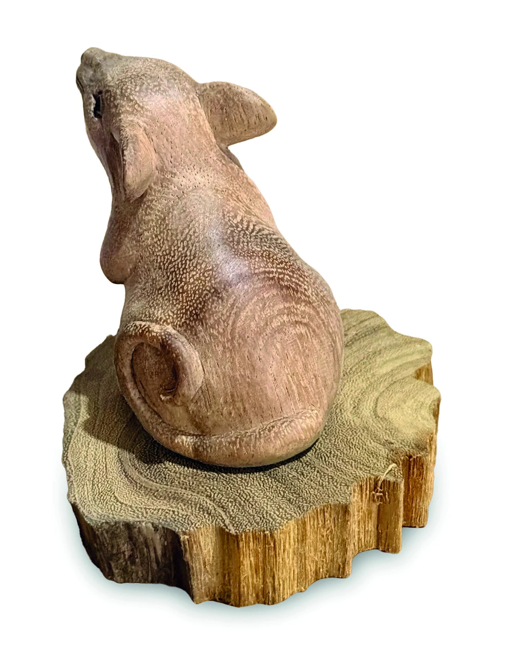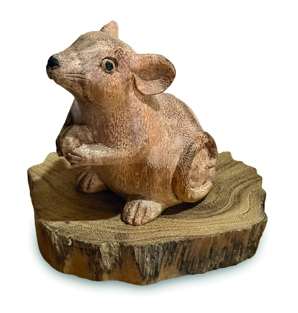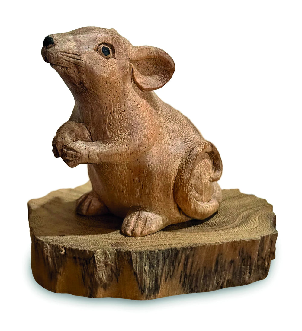 Adorable little mouse, sitting up on its hind legs holding a tasty treat. Hand-carved from suar wood with charming detail.