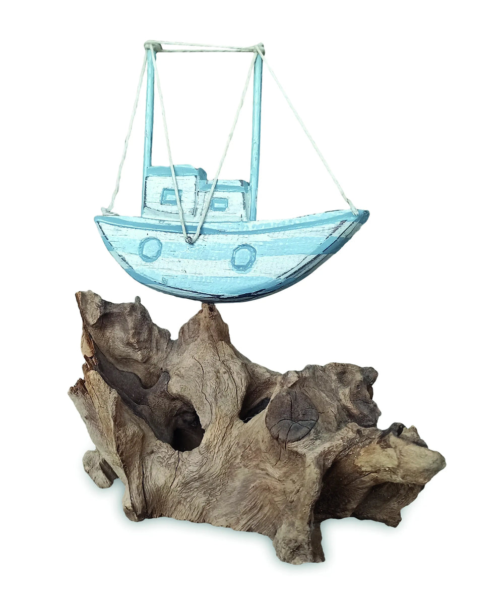 Fun little nautical sculpture featuring a ship stranded on wooden rocks. Hand-carved from sustainable suar wood and hand-painted with rope detail.
