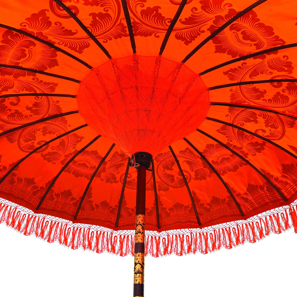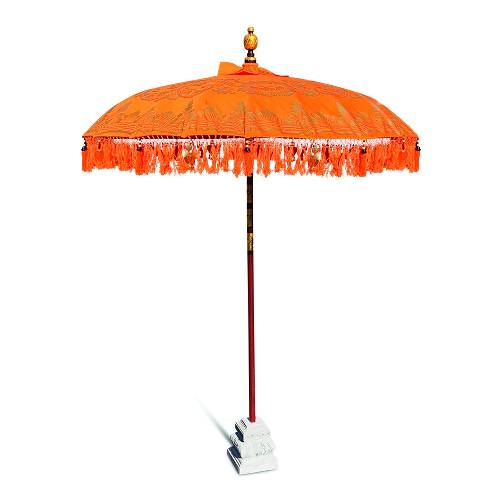 A hand-made Balinese ceremonial parasol crafted by a small family workshop in Ubud, Bali. The vibrant Citrus Orange and Gold canopy is hand-printed and hand-painted, with hand-woven and hand-carved details that give each parasol its own character.