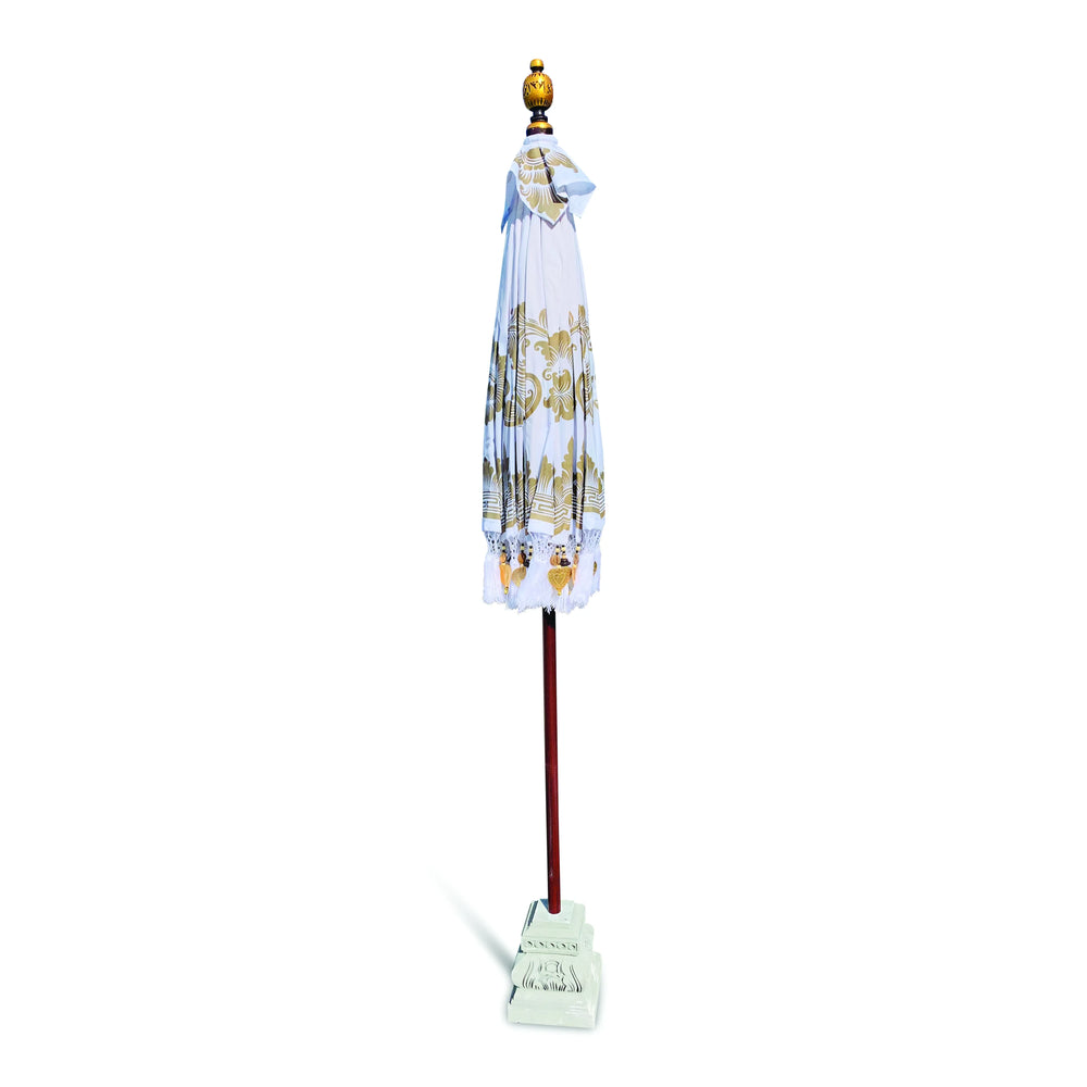 This hand-made Balinese ceremonial parasol is crafted by a small family workshop in Ubud. Each piece is hand-carved, hand-printed, hand-woven and hand-painted, giving every parasol unique character and artisanal detail that suits decorative and ceremonial use.
