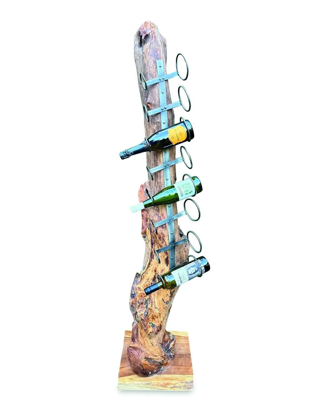 - Functional sculpture: Holds eight bottles while doubling as a sculptural stand; the metal mount keeps bottles secure without obscuring the wood’s natural silhouette.