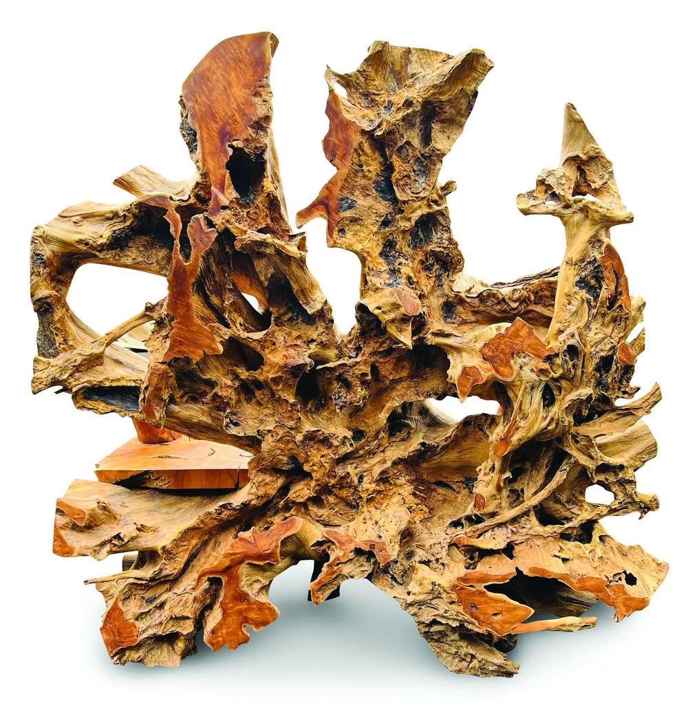 - Hand-carved from genuine teak root — a one-off, sculptural bench where every piece is unique and shows individual grain and root formation.