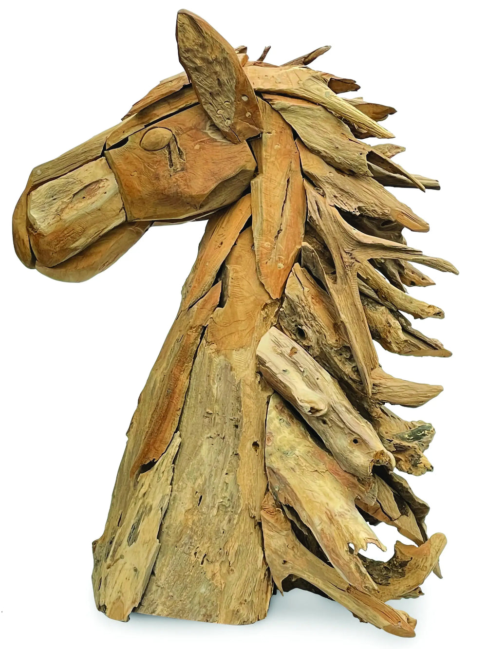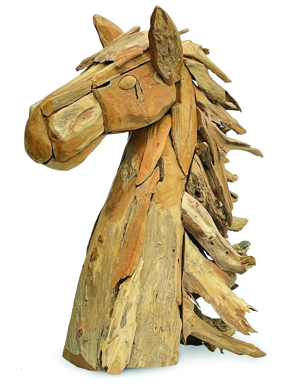 This striking Horse's Head sculpture is hand carved and sculpted by Indonesian artists from teak tree roots. The natural grain and root forms give each piece a distinct personality, so no two sculptures look the same.