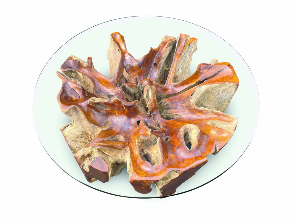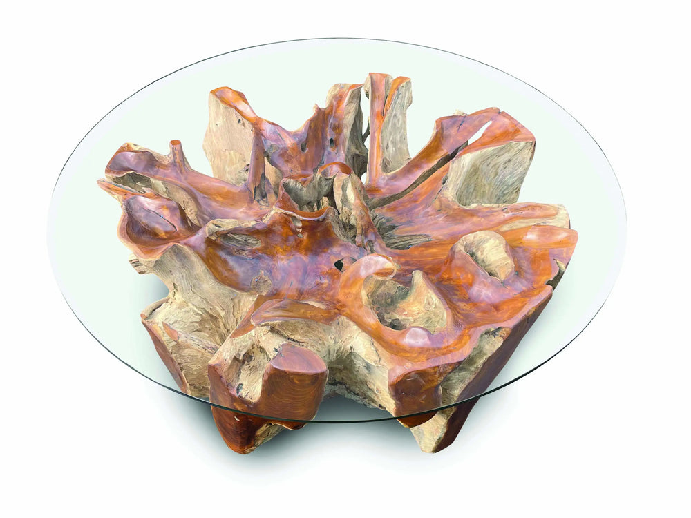 The Root Lombok is a striking round coffee table that pairs a large 110cm safety glass top with an irregular natural root wood base. Each table is hand crafted, so the grain, colour and silhouette of the root will be unique — a true statement piece for a living room or reception space.
