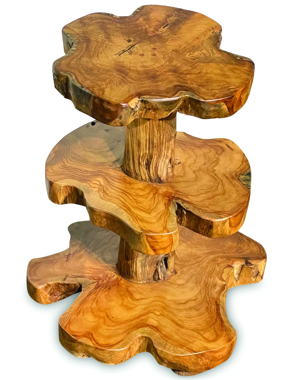 - Natural variations celebrated: small knots, fissures and colour differences are inherent to root timber and enhance the rustic, artisanal character.