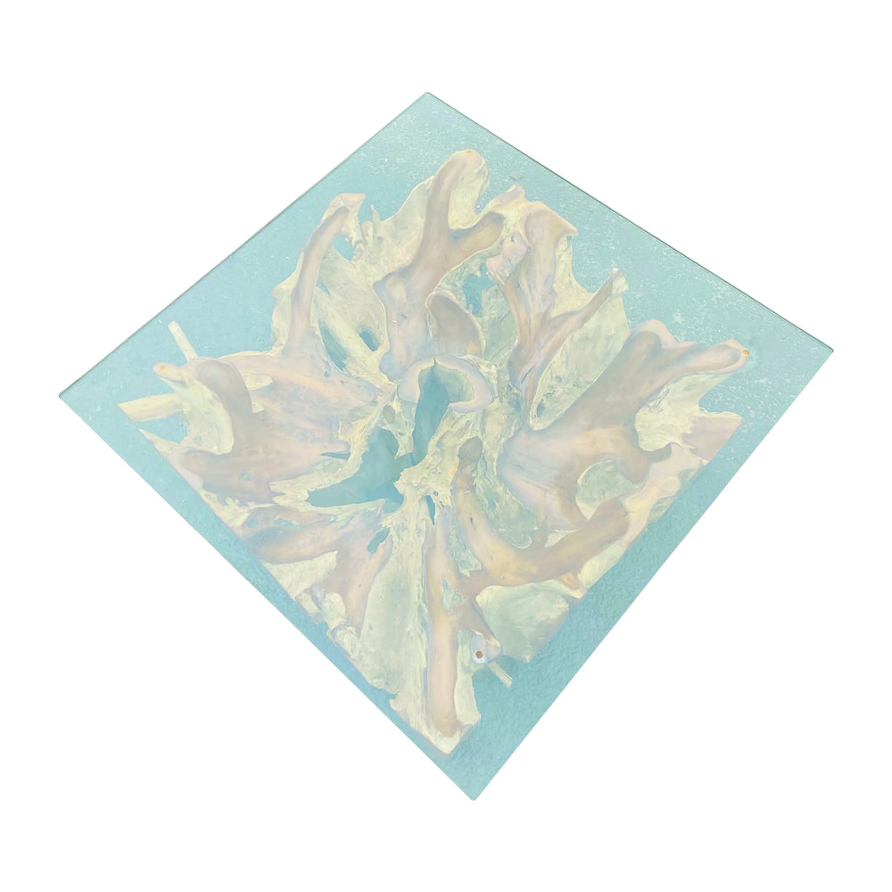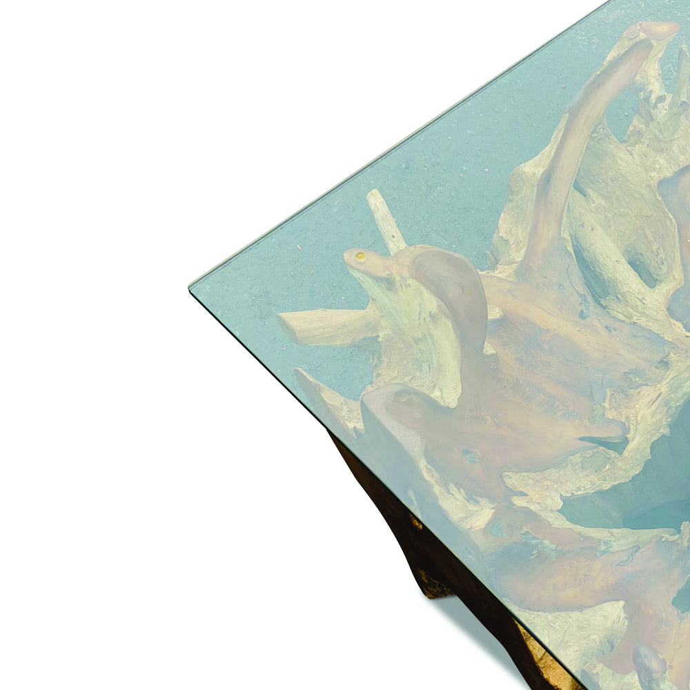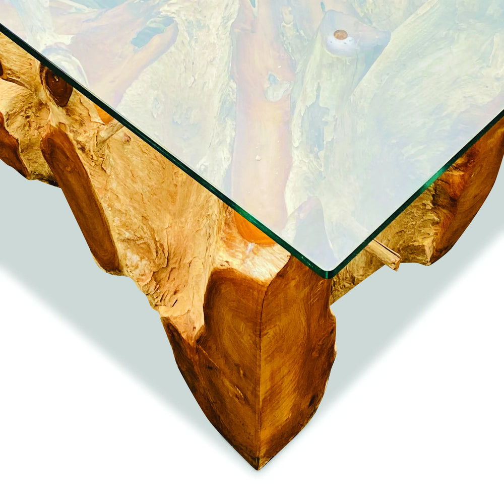 The glass top gives a clear view of the intricate root base while providing a stable, easy-to-clean surface for drinks and decor. The base dimensions are approximately W 80 x D 80 x H 45 cm, while the glass top covers a 90 x 90 cm footprint, giving the table visual presence and practical surface area.