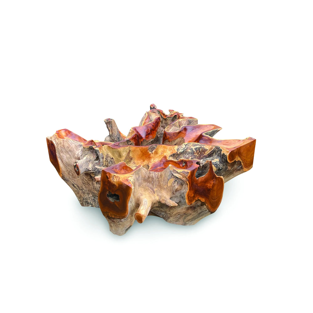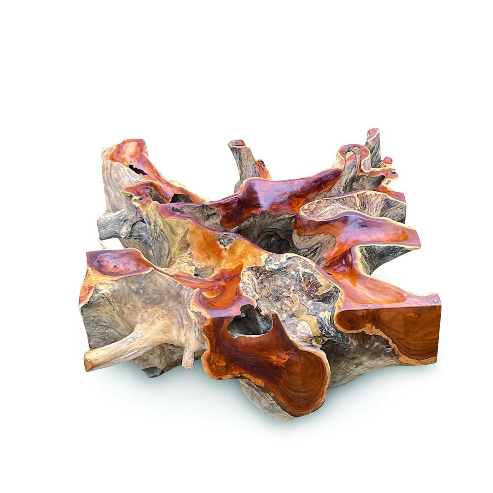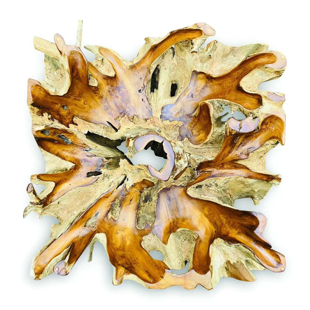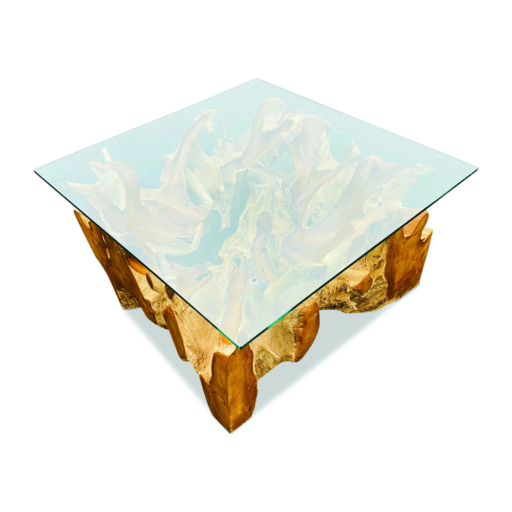 This Root Square Lombok coffee table pairs a 90 x 90 cm safety glass top with a sculptural natural root wood base to create a strong statement in any living space. Each table is hand crafted from a natural root, so grain, colour and shape vary — no two pieces are the same.