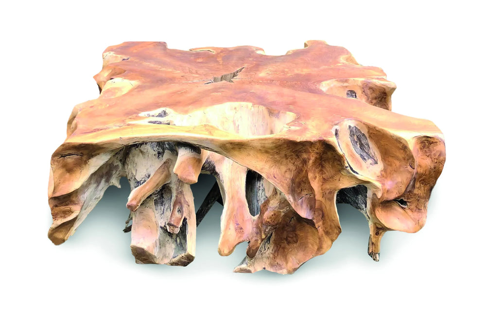 The Lombok Solid Coffee Table is hand-sculpted from a single slice of root network, then smoothed across the top to create a striking, tactile surface. Its square footprint and substantial presence make it a strong centrepiece for living rooms seeking organic, sculptural character.