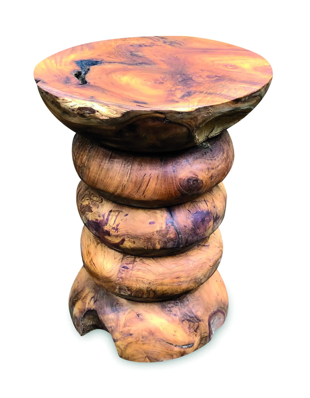 The Teak Babybel Lamp Table is a compact, sculptural side table formed from hand-carved teak root discs. A larger, flat-topped disc provides the tabletop, supported by a stacked arrangement of smaller root slices for an organic, one-of-a-kind silhouette that works beautifully as a lamp or accent table.