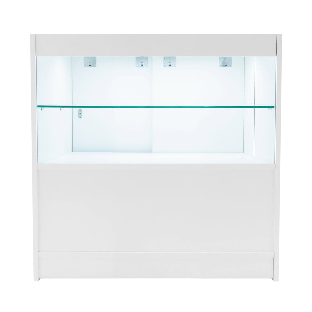 Storage and display needs are thoughtfully balanced in this design. The cabinet features three shelves two display shelves for highlighting feature items, and one enclosed shelf for more secure storage. Two lockable sliding doors at the rear, supplied with two keys, offer secure access to your stock while maintaining a streamlined appearance from the customers viewpoint.