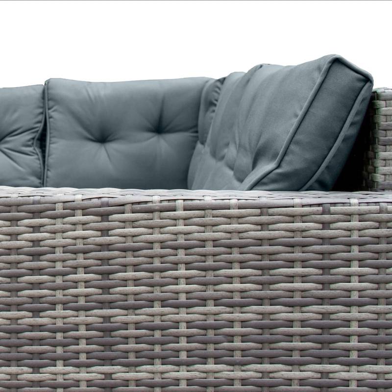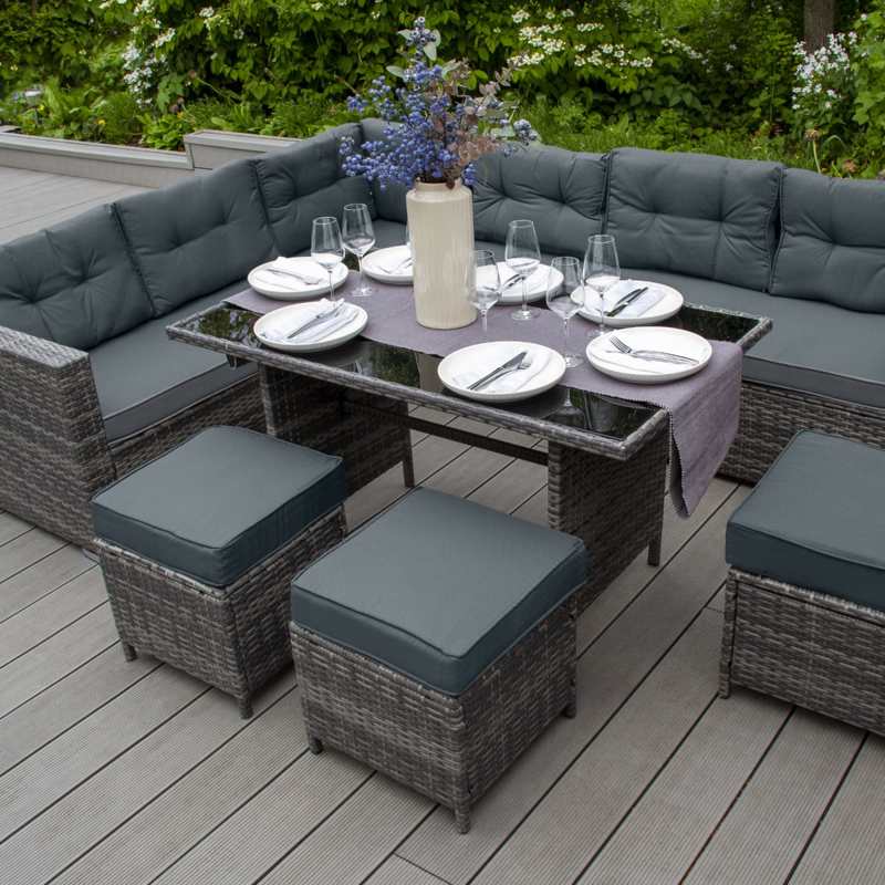 Indulge in the epitome of luxury with our 9-seater rattan furniture corner set from the exquisite Jard range. This dining set, comprising a corner sofa, 3 stools, and a glass top table, is meticulously crafted for optimal style and comfort. The striking grey rattan is complemented by extra-thick, beautiful grey cushions, adding a contemporary and lavish touch to your garden. Protected by a UV layer, this set withstands the elements throughout the year while preserving its stunning colour.