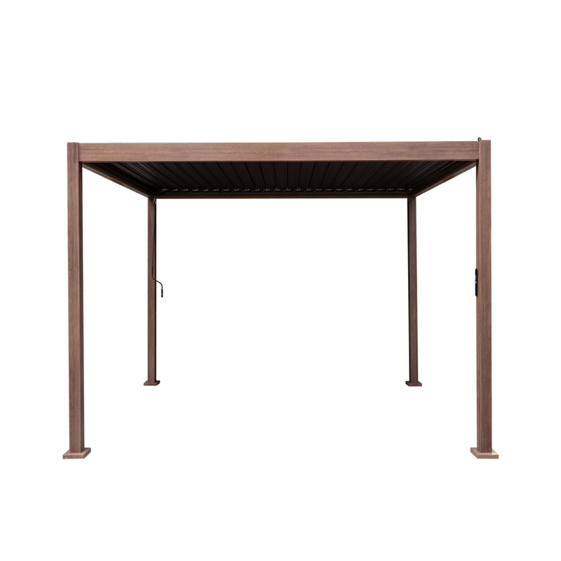 With its adjustable louvers, our wooden effect pergola gives you full control over sunlight and shade, allowing you to customise your outdoor environment to suit your needs and preferences. Whether you desire a sun-drenched retreat or a shaded sanctuary, simply adjust the louvers with the easy-to-use manual system.