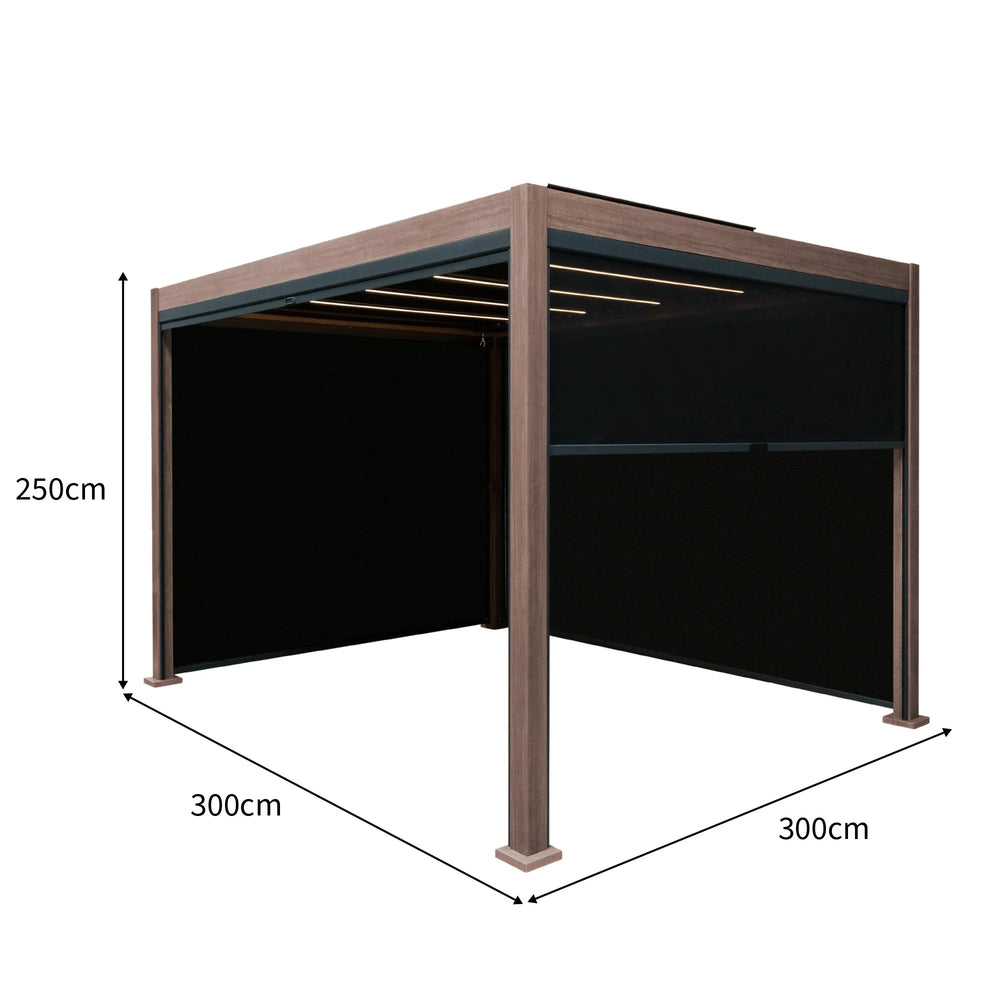 Elevate your outdoor living experience and create unforgettable moments with friends and family in the comfort of your own backyard with this 3m x 3m wood effect aluminium pergola with blinds and LED lights.