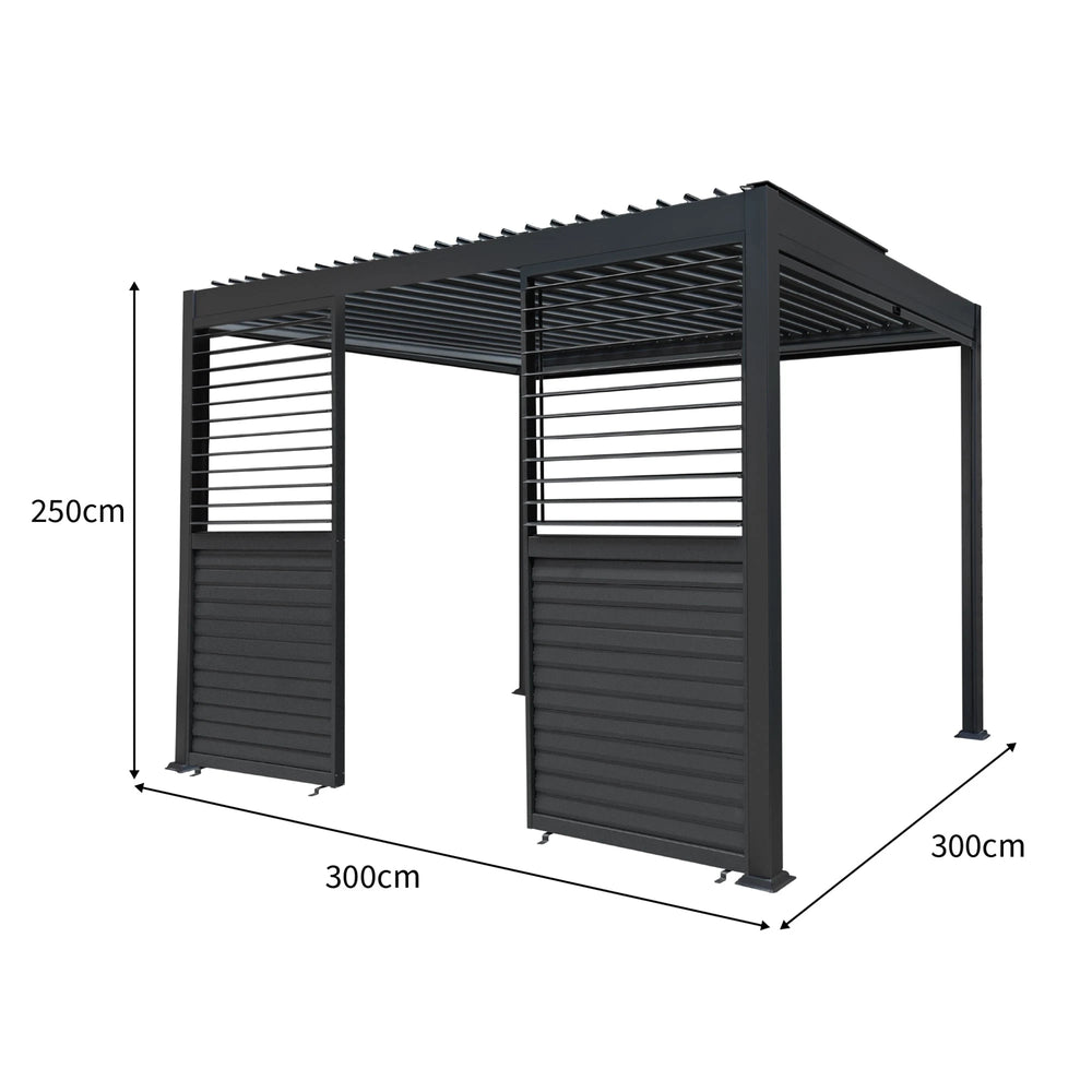 Elevate your outdoor living experience and create unforgettable moments with friends and family in the comfort of your own backyard with this 3m x 3m anthracite grey aluminium pergola with blinds, side panels and LED lights.
