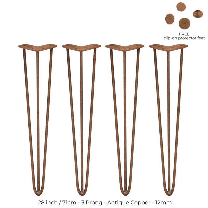 4 x 28" Hairpin Legs - 3 Prong - 12mm - Antique Copper