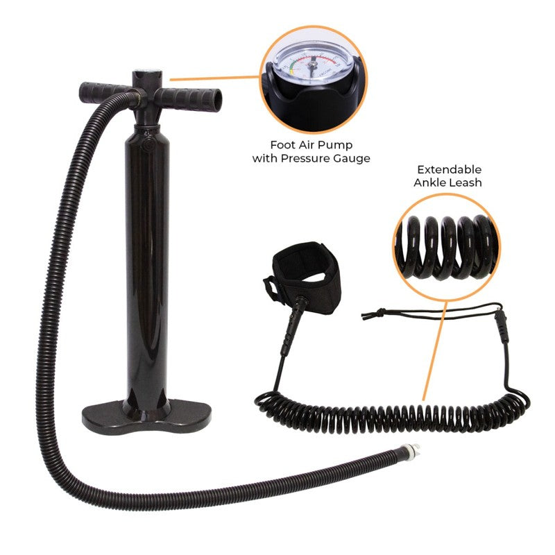 The paddle board includes a coil leash with an adjustable ankle strap to prevent the SUP from drifting away if you fall into the water. The cord stretches to an incredible 3 metres for greater freedom of movement and superior board safety. Its coiled design helps stop it from dragging in the water and slowing you down.