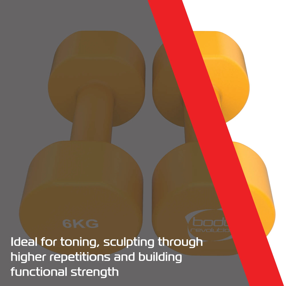 Suitable for use at home, outdoors, or in a professional gym setting, these neoprene dumbbells combine practicality, durability, and performance. They embody Body Revolutions mission to make high-quality strength equipment accessible to everyone, supporting your journey from first step to fitness success. Compact, reliable, and easy to use, they are a must-have for anyone looking to enhance their workouts with light resistance.