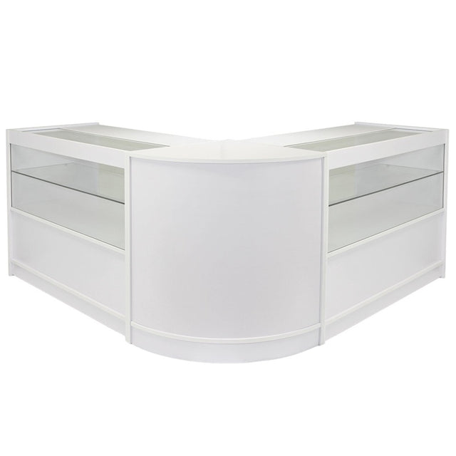 The closed CM60 counter is a curved retail display unit with storage shelves to the rear. The unit is designed to connect any combination of the A1200, B1200, C1200 or K1200 counters together to create a large L shaped counter set but can also be used as a standalone unit.